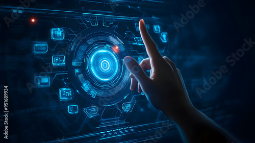 Hand touch digital hud interface futuristic technology background of virtual computer screen display ui future concept or cyber communication hologram and innovation internet system on vr cyberspace.