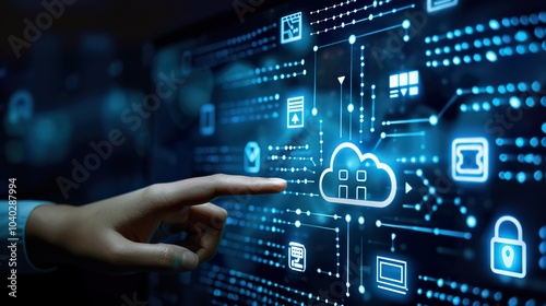 Hand touching a virtual screen with futuristic Smart energy storage technology icons on a dark blue background, representing a data center, server room, or network security concept.