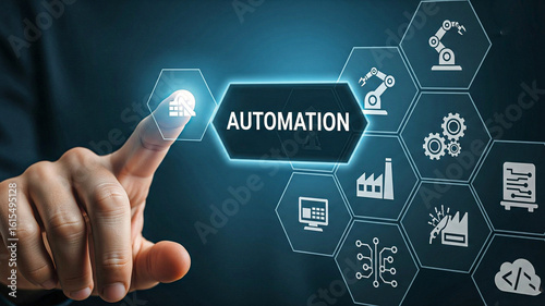 Hand touching futuristic automation interface; digital factory, robotic arm, industry 4.0 concept.