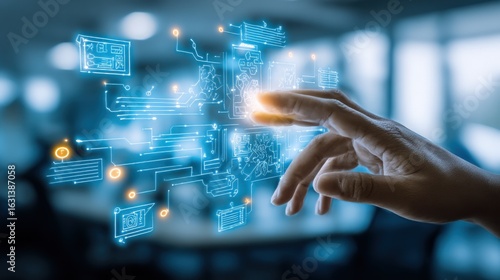 Hand Touching Futuristic Interface: Digital Transformation, Cloud Computing, and Innovative Technology Concept