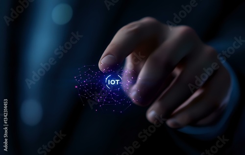 Hand touching glowing IoT symbol with scattered digital particles in dark blue atmosphere, representing modern connectivity and smart technology advancement.