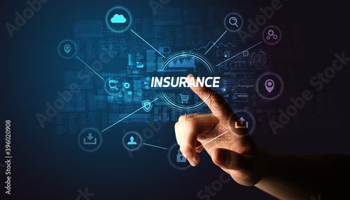 Hand touching INSURANCE inscription, Cybersecurity concept