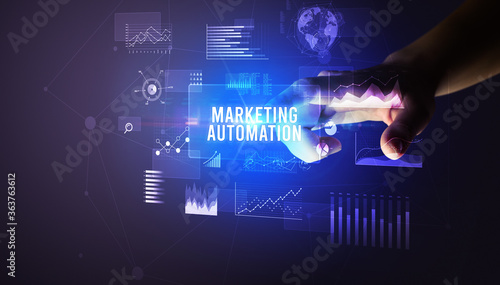 Hand touching MARKETING AUTOMATION inscription, new business technology concept