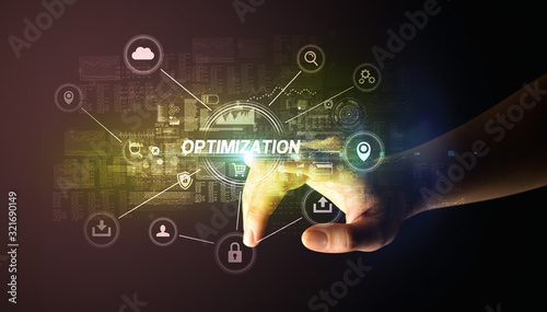Hand touching OPTIMIZATION inscription, Cybersecurity concept