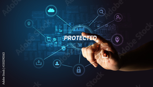 Hand touching PROTECTED inscription, Cybersecurity concept