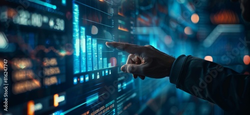 Hand touching virtual screen displaying a rising stock market growth graph chart against a financial business background concept.