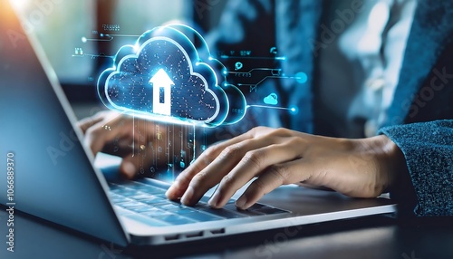 Hand typing on laptop keyboard with cloud icon and data transfer symbol overlay, showing cloud computing.