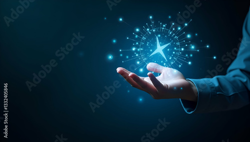 Hand Using Holographic AI Image Creation Software on Laptop to Generate Futuristic Images in Empty Space - Visual Prompts and Photo Stock Concept for Creative Design