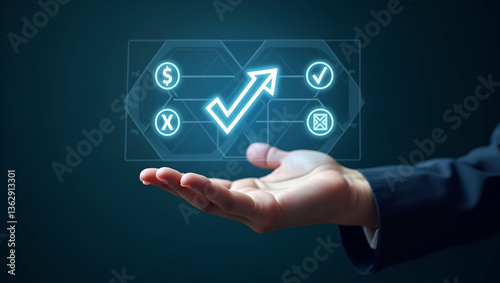 Hand Using Holographic Cost Reduction Device: Visualizing Budget Decrease & Expense Management Icons