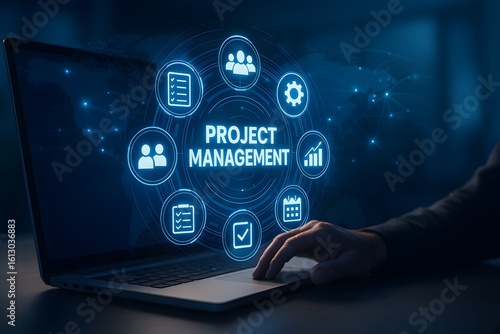 Hand using laptop with glowing icons showing project management planning teamwork schedule tasks and performance tracking