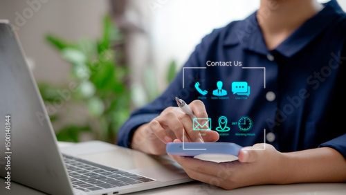 Hand using smartphone with glowing contact us icons including phone, email, live chat and support services, concept for online customer communication and digital assistance.