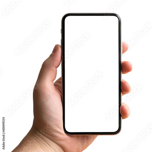 Hand with a smartphone on a white background. Created with Generative AI tools