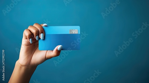 Hand with blue nail polish holding a blue credit card against a blue background.