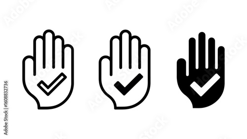 Hand with Checkmark Icon: Three Variations, Line Art, Black and White, Approval, Confirmation, Positive Feedback, Simple Design.