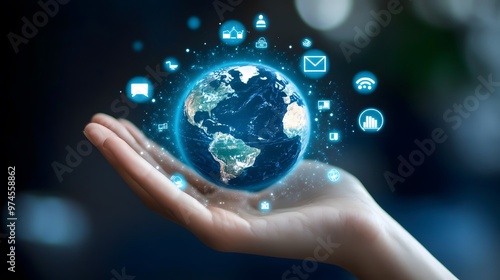 Hand with Earth Surrounded by Technology Icons: A hand holding the Earth, surrounded by floating technology icons, symbolizing the digital world's impact on the planet.