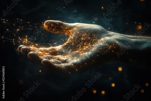 Hand with glowing network, dark backdrop, copy space