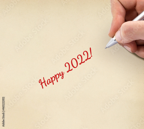 Hand writing "Happy 2022!" on yellow sheet of paper.