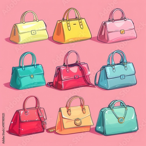 Handbags flat design bird's-eye view runway theme anime 3D render Triadic Color Scheme,