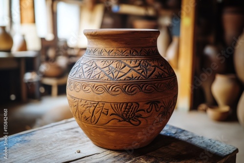 Handcrafted clay pot with intricate carvings, displayed in a pottery workshop.