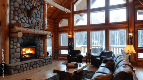 Handcrafted log home with a stone fireplace and panoramic windows, offering warmth and comfort in a natural setting.