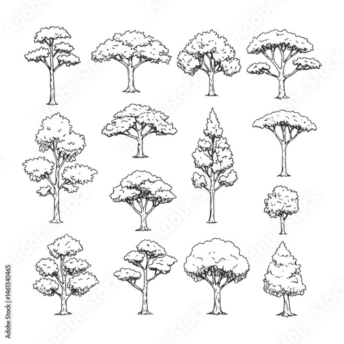 Hand-drawn architectural tree sketches in minimalist style, various tree types in side view for landscape design and CAD drafting, perfect for professional use