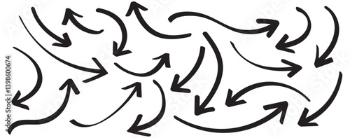 hand-drawn arrow marker. Hand-drawn brush stroke arrows on transparent background. Black charcoal ovals and arrows strokes different forms. Hand drawn vector arrows doodle set on white background.