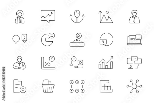 Hand-drawn business icon set: charts, graphs, people, search, shopping cart, documents, communication bubbles, currency symbols. Minimalist vector line art illustrations, doodle style design elements
