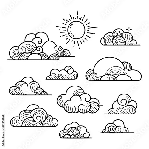 Hand-Drawn Cloud & Sun Doodle Set – Whimsical Sketches of Swirling Clouds and Radiant Sun