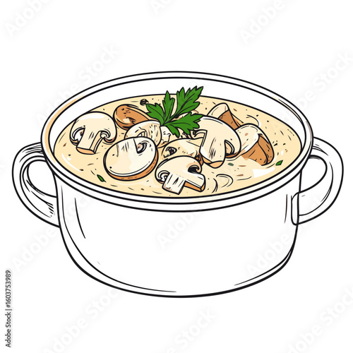 Hand-drawn creamy mushroom soup with sliced champignons and parsley in a white two-handled bowl.