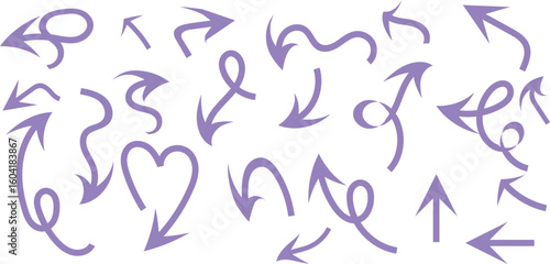 Hand-drawn decorative arrows in playful curved styles, including loops, spirals, and heart shapes. Great for presentations, infographics, journaling, or creative visual directions and guides.