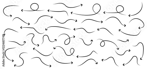 Hand-drawn Doodle arrows icon set or graphics collection. Pointer icons. Pointer graphic symbols. Sketch arrow design for business plan and education. Vector illustration.