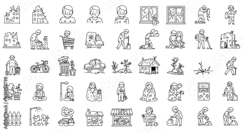 Hand-drawn line art icons illustrating global social and environmental issues, including poverty, homelessness, disaster aftermath, pollution, and community cleanup efforts.