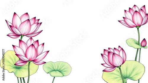 Hand-drawn lotus flowers on white background, nature, water lily, floral