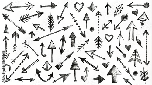 Hand-Drawn Pencil Sketch Arrow Collection Diverse Styles, Black and White Composition, Abstract Graphic Design, Vector Arrows Arrow, Sketch, Design