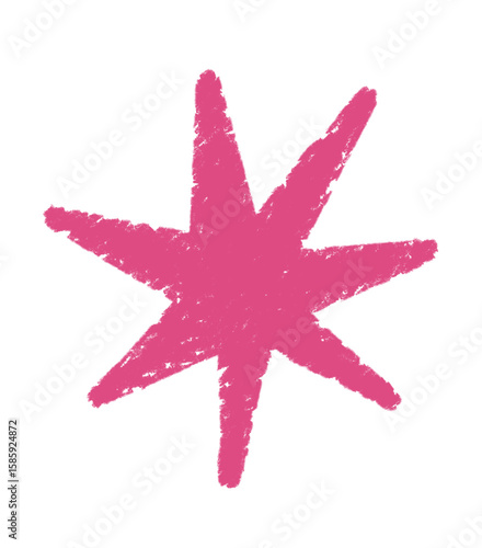 Hand-drawn pink star crayon starburst with rough texture on black background. Playful abstract geometric shape element, for kids art, education design, creative branding, or fun retro illustrations.