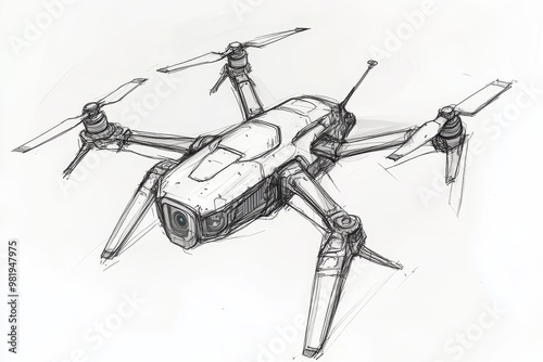 Hand-drawn sketch of a drone with four propellers and a camera.