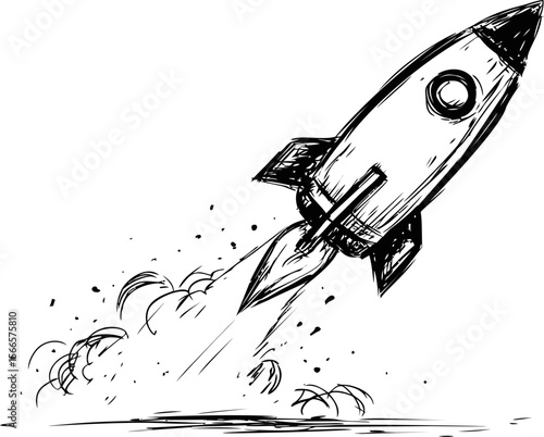 Hand-drawn sketch of a rocket launching into the sky with smoke trails