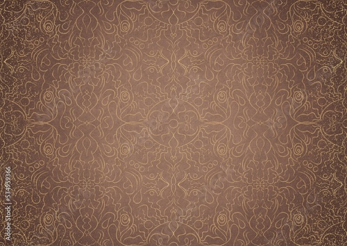 Hand-drawn unique abstract gold ornament on a light brown background, with vignette of darker background color and splatters of golden glitter. Paper texture. Digital artwork, A4. (pattern: p07-1b)