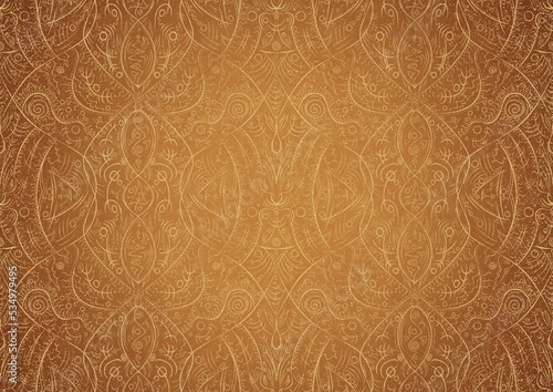 Hand-drawn unique abstract gold ornament on a yellow background, with vignette of darker background color and splatters of golden glitter. Paper texture. Digital artwork, A4. (pattern: p08-2b)
