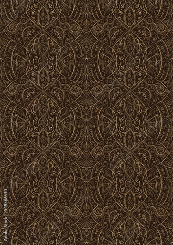 Hand-drawn unique abstract symmetrical seamless gold ornament on a dark brown background. Paper texture. Digital artwork, A4. (pattern: p08-2e)