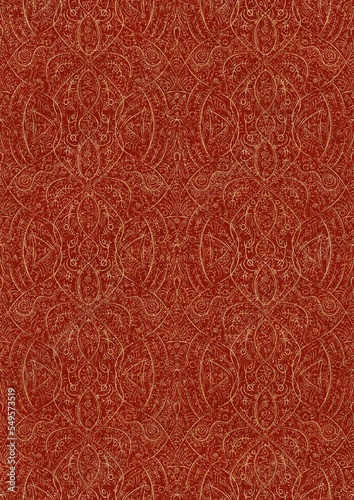 Hand-drawn unique abstract symmetrical seamless gold ornament with splatters of golden glitter on a bright red background. Paper texture. Digital artwork, A4. (pattern: p08-2e)