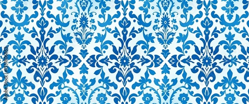 Hand-drawn watercolor blue damask horizontal seamless pattern, texture, background