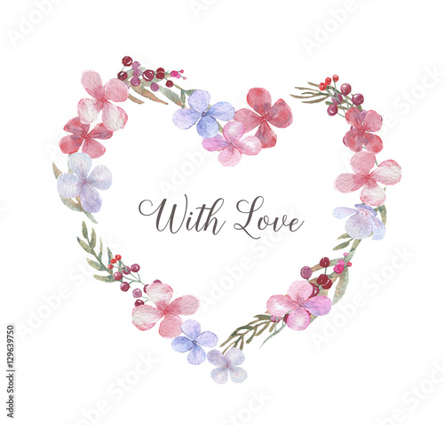 Hand-drawn watercolor tender and romantic heart. Floral frame with hydrangea flowers and different branches and leaves. Card or wedding invitation design template