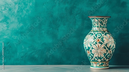 Handmade Ceramics concept. A colorful vase with intricate designs stands against a textured teal background, creating a striking visual contrast.