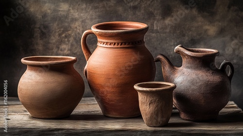 Handmade Clay Pots and Jugs on Wooden Table in Close-Up. AI generated illustration