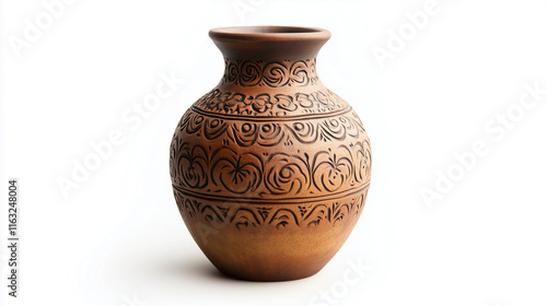 Handmade clay vase with intricate patterns isolated on white background for pottery lovers