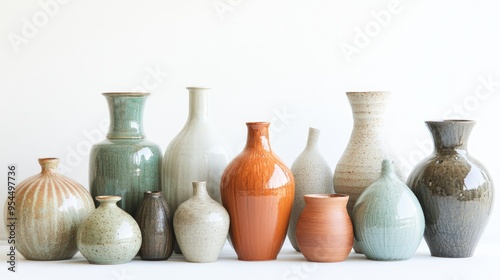 Handmade pottery vases in a variety of shapes and colors, arranged together as a vintage ceramic collection.