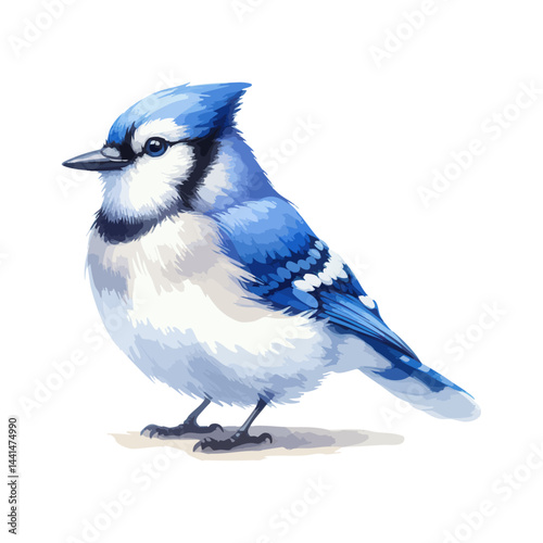 Handmade watercolor of a Blue Jay standing, featuring vivid blue feathers and soft brushstrokes, isolated on a clean white background for versatile designs