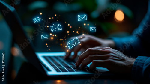 hands and man with laptop, typing and notebook with email