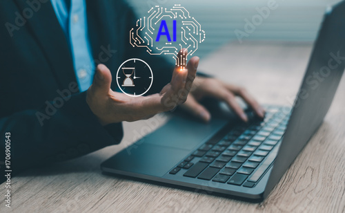 Hands businessman holding digital AI brain holograms above laptop artificial intelligence technology concepts futuristic innovation machine learning human computer interaction smart business solutions